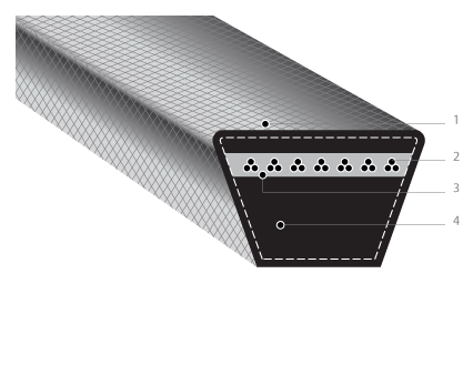 Estas correas están fabricadas con caucho de natural y SBR y reforzadas con hilos de de poliester, ademas de estar envueltas en un capa de tela mezcla de algodón y poliester.